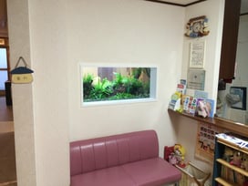 歯科医院でのプチリフォーム。壁をくりぬいて熱帯魚を泳がせました。殺風景だった受付が明るくなり、普段は歯医者嫌いな子供たちにも評判◎。