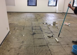 まずは既存のタイルカートを剥がして、糊の剥離を行いました。既存の糊の上からでは、新たにはる予定の塩ビシートが剥がれやすくなるので、手間のかかる作業ですが大事な作業になります。