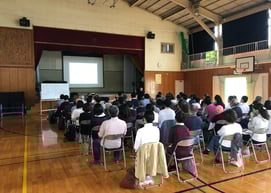 今回の会場は、本年度で休校となる小学校の体育館です。もともと当団地の為に建てられた小学校だったとの事で、それだけ団地に子供が減っていることになります。
