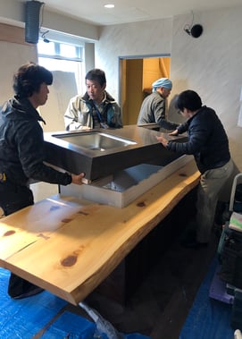 キッチンには業務用の機器、壁面収納には大型水槽が入ります。