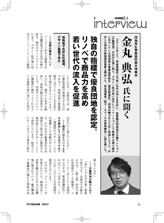 私たちの団地再生事業も11年目になりました。先日、月刊不動産流通様から取材を受け、同誌2023年1月号に掲載いただきました。