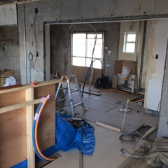 まずは、隠れる部分の配管、配線を行いその後床上げを行います。集合住宅では床に遮音等級が求められますので、今回は床上げの際の束材とパーティクルボードで遮音等級を確保しています。