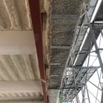 これは、火災時に構造体である鉄骨が燃える(溶ける)のを防ぐために、耐火材を鉄骨に吹きつける工程です。